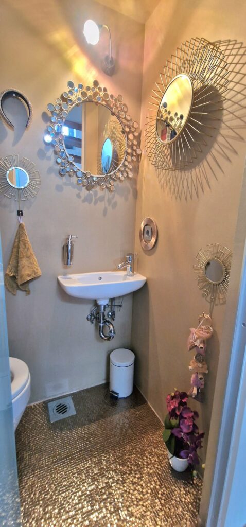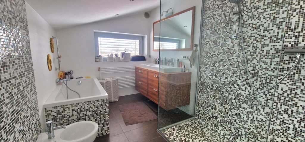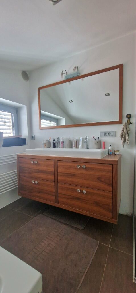 Po celotni hiši je položen kakovosten parket iz beljenega hrasta priznanega proizvajalca Alpod, ki prostoru daje toplino in brezčasen videz. Na voljo sta dve sodobno urejeni kopalnici.