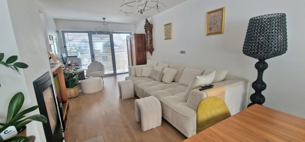 Hiša obsega neto tlorisno površino 144,9 m2. Posebno vrednost predstavlja atrij oziroma terasa v velikosti približno 40 m2, ki nudi zaseben in prijeten zunanji prostor za sprostitev ali druženje.