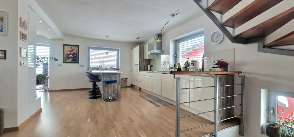 Prvo nadstropje trenutno predstavlja odprt in izjemno svetel dnevno bivalni prostor z kuhinjo in dodatnim WC-jem za goste. V kotu prostora je diskretno umeščen delovni kotiček, ki omogoča mirno delo od doma, hkrati pa ohranja občutek prostornosti in zračnosti. Višina stropov znaša 2,43 m, prostor pa se lahko po prvotnih načrtih preuredi v tri ločene sobe, kar hiši daje dodatno fleksibilnost. Nadstropje ima tudi balkon.